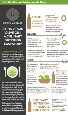 Cobram Estate is committed to health and to educating both health professionals and the public on the benefits of extra virgin olive oil. Through this website and our broader program, we aim to empower health professionals with credible, evidence-based information and resources to support their work and highlight the health benefits of Cobram Estate Extra Virgin Olive Oil.